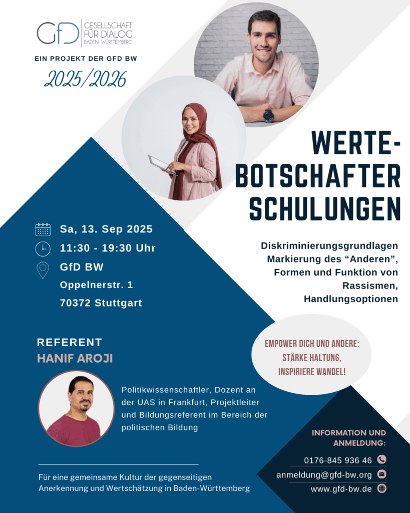 Die Gesellschaft für Dialog Baden-Württemberg setzt sich für einen offenen, respektvollen und konstruktiven Austausch in unserer vielfältigen Gesellschaft ein. Wir schaffen Räume für Begegnung, fördern Verständigung zwischen unterschiedlichen Gruppen und stärken den demokratischen Dialog. Unser Ziel ist es, durch Zuhören, Austausch und Beteiligung den gesellschaftlichen Zusammenhalt in Baden-Württemberg nachhaltig zu fördern.