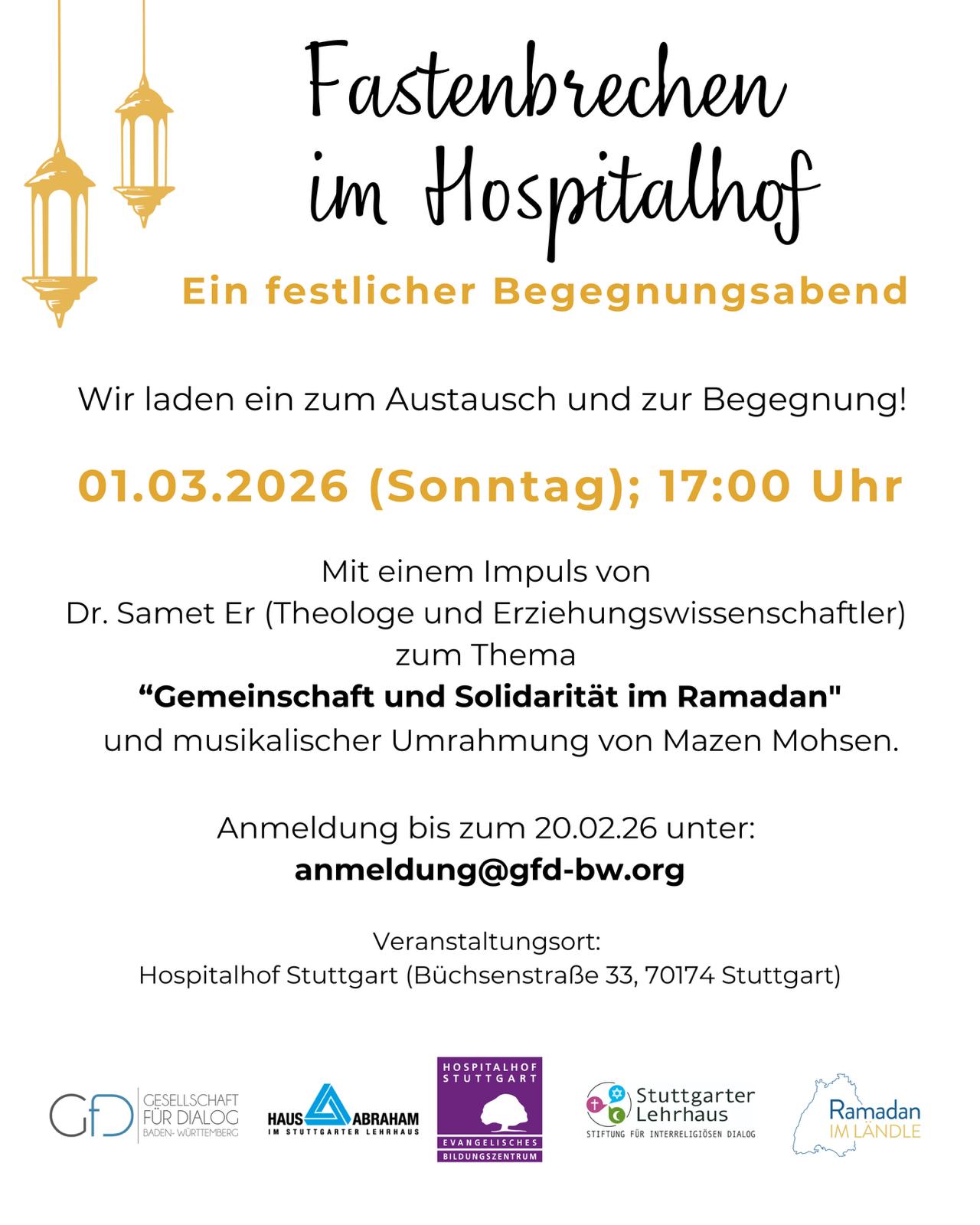 Die Gesellschaft für Dialog Baden-Württemberg, Haus Abraham und das Evangelische Bildungszentrum Hospitalhof Stuttgart laden Sie herzlich zum gemeinsamen Fastenbrechen ein.